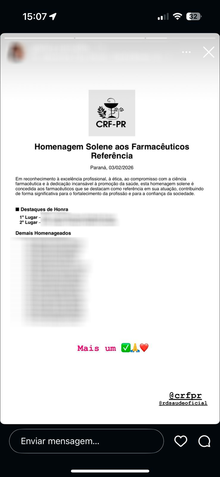 O CRF-PR informa que não está promovendo, organizando ou divulgando qualquer homenagem relacionada a uma listagem de supostos farmacêuticos que vem sendo compartilhada em publicações realizadas por terceiros nas redes sociais.