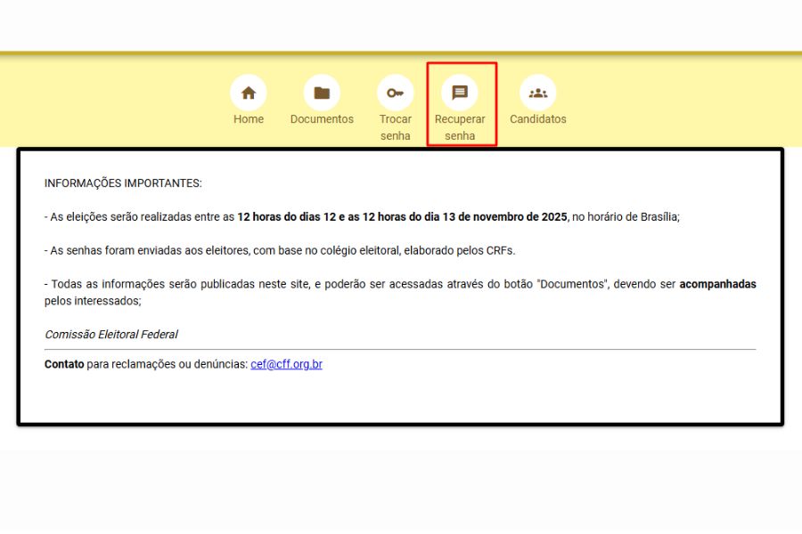 Mas ATENÇÃO! A senha será enviada para o e-mail cadastrado no CRF-PR. No cadastro, não pode conter dados duplicados. Os dados são exclusivos para cada profissional. Dados de outro profissional no mesmo cadastro, impedirá a participação nas eleições.